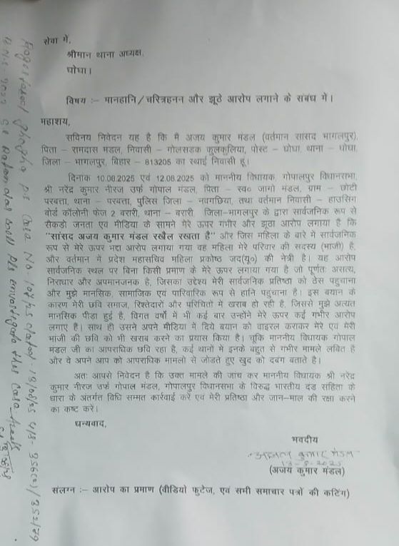 भागलपुर से जदयू सांसद अजय कुमार मंडल (वर्तमान सांसद) ने अपनी ही पार्टी के गोपालपुर विधानसभा के जदयू विधायक गोपाल मंडल पर मानहानि, चरित्र हनन और झूठे आरोप लगाने का गंभीर आरोप लगाया है। इस मामले में सांसद ने घोघा थाना अध्यक्ष को लिखित आवेदन देकर विधायक के खिलाफ कानूनी कार्रवाई की मांग की है।