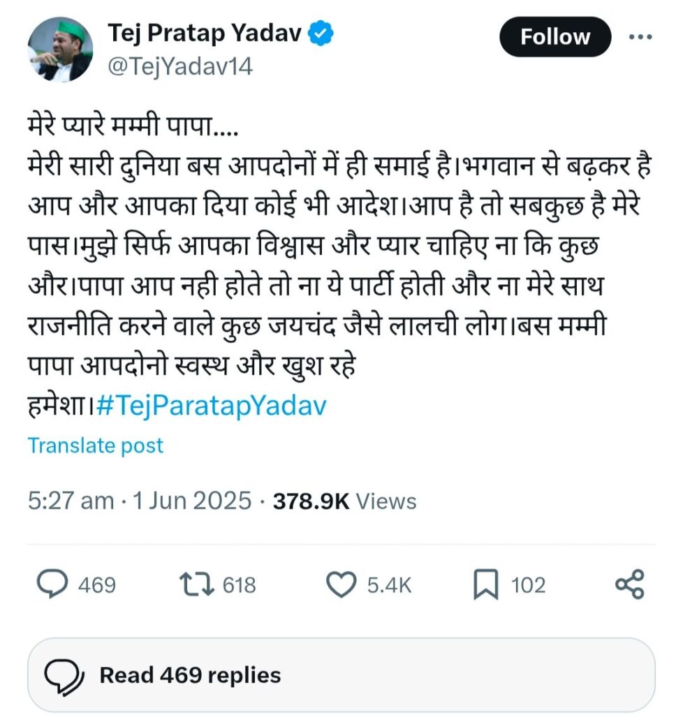 तेज प्रताप यादव ने अपने पोस्ट में लिखा, “मेरे प्यारे मम्मी-पापा… मेरी सारी दुनिया बस आप दोनों में ही समाई है। भगवान से बढ़कर हैं आप और आपका दिया कोई भी आदेश। आप हैं तो सबकुछ है मेरे पास। मुझे सिर्फ आपका विश्वास और प्यार चाहिए, ना कि कुछ और। पापा, आप नहीं होते तो ना ये पार्टी होती और ना मेरे साथ राजनीति करने वाले कुछ जयचंद जैसे लालची लोग। बस मम्मी-पापा, आप दोनों स्वस्थ और खुश रहें हमेशा।”