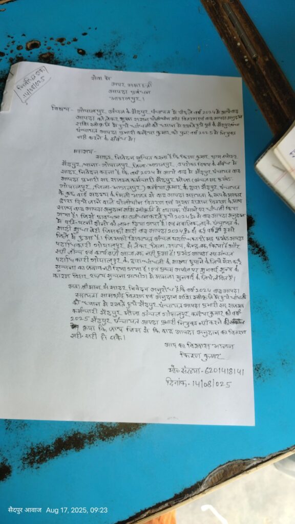 गोपालपुर अंचल के सैदपुर पंचायत में वर्ष 2024 की बाढ़ आपदा राहत सामग्री एवं अनुदान राशि वितरण में बड़े पैमाने पर धांधली का मामला उजागर हुआ है। स्थानीय ग्रामीण किरण कुमार (ग्राम क्योट, सैदपुर) ने जिला प्रशासन से शिकायत कर यह मांग की है कि इस घोटाले में संलिप्त माने जा रहे पंचायत आपदा प्रभारी सह राजस्व कर्मचारी कन्हैया कुमार को आगामी वर्ष 2025 में फिर से नियुक्त न किया जाए।