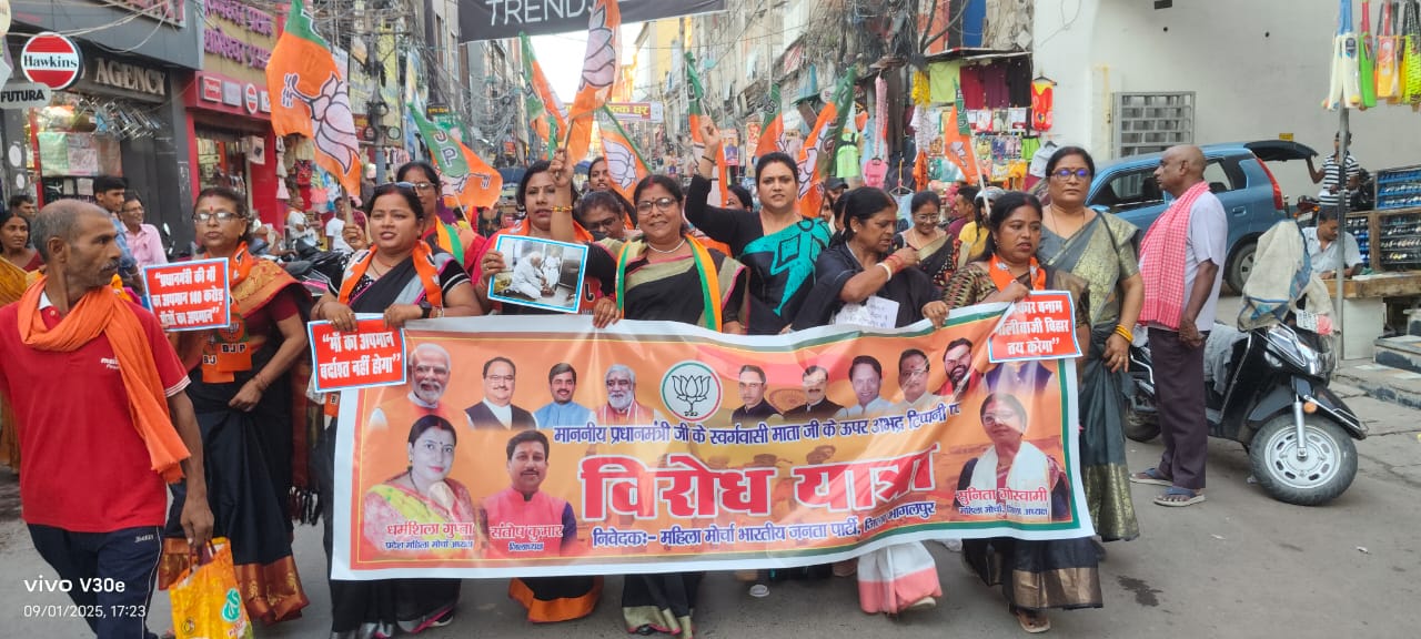 प्रधानमंत्री नरेंद्र मोदी की स्वर्गीय माता के खिलाफ अपमानजनक टिप्पणी को लेकर आज भागलपुर में भाजपा महिला मोर्चा ने जोरदार विरोध यात्रा निकाली। महिला मोर्चा की पदाधिकारियों और कार्यकर्ताओं ने कांग्रेस नेता राहुल गांधी और राजद से जुड़े नेताओं पर हमला बोलते हुए कहा कि यह बयान न केवल प्रधानमंत्री की माता का, बल्कि पूरे देश की माताओं का अपमान है।