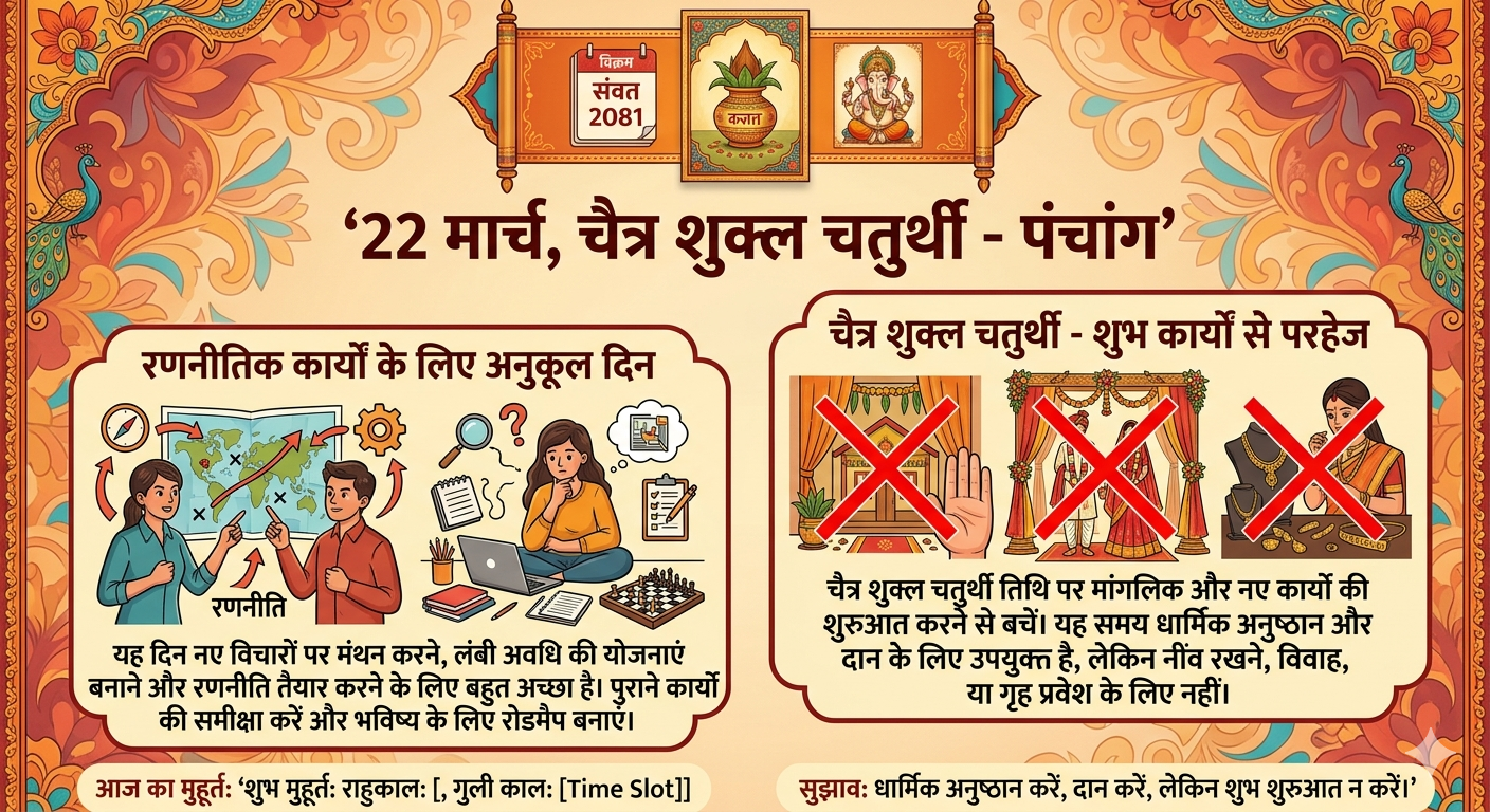 हैदराबाद: आज रविवार, 22 मार्च 2026 को चैत्र माह की शुक्ल पक्ष की चतुर्थी तिथि है, जो भगवान गणेश को समर्पित मानी जाती है। धार्मिक मान्यताओं के अनुसार, यह तिथि बुद्धि, रणनीति और विघ्नों को दूर करने से जुड़ी होती है। हालांकि, इसे रिक्ता तिथि भी कहा जाता है, जिसके कारण इस दिन किसी भी प्रकार के शुभ या मांगलिक कार्य करने से बचने की सलाह दी जाती है।