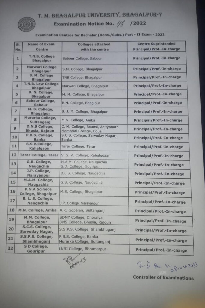 विश्वविद्यालय द्वारा जारी लिस्ट के अनुसार TNB कॉलेज में सबौर कॉलेज के छात्रों का परीक्षा केंद्र बनाया गया है। उसी तरह से बनारसी लाल सर्राफ कॉलेज नवगछिया में जेपी कॉलेज नारायणपुर के छात्रों का परीक्षा केंद्र बनाया गया है। इसके साथ ही जेपी कॉलेज नारायणपुर में बनारसी लाल सर्राफ कॉलेज नवगछिया के छात्रों का परीक्षा केंद्र बनाया गया है। इसी तरह से मदन अहिल्या महिला कॉलेज नवगछिया का परीक्षा केंद्र जीबी कॉलेज नवगछिया में और जीबी कॉलेज का केंद्र मदन अहिल्या कॉलेज में बनाया गया है।