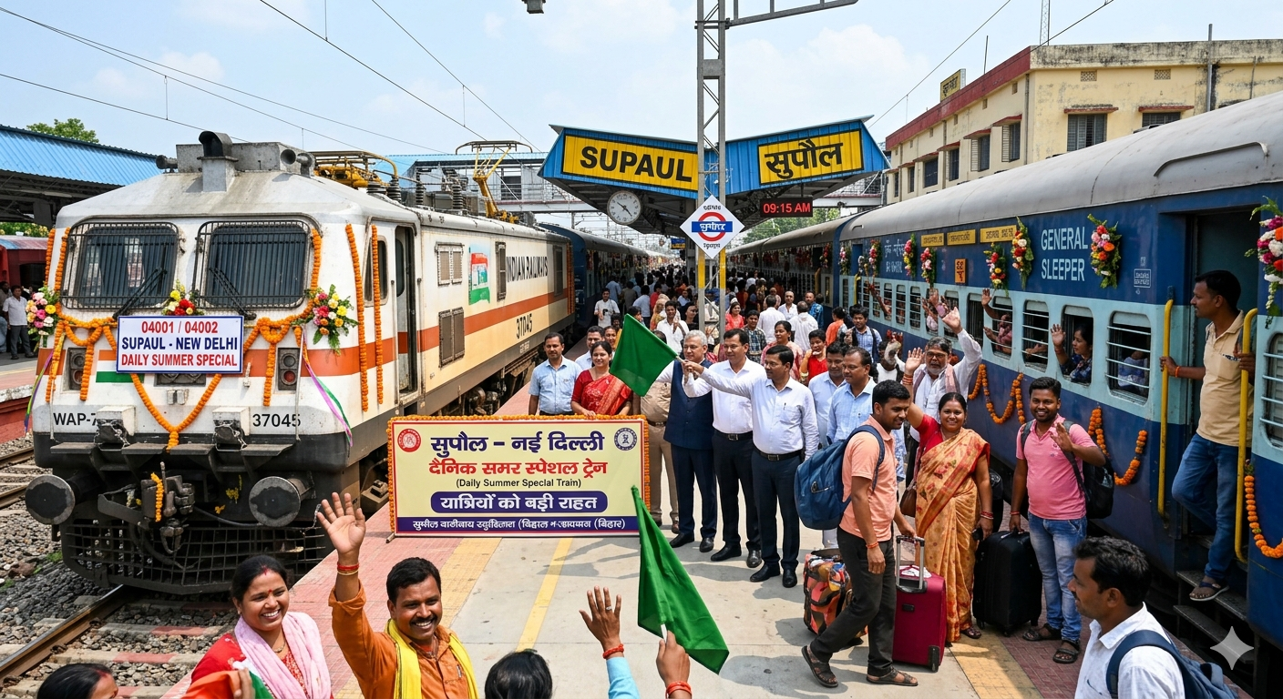 ग्रीष्मकालीन छुट्टियों के दौरान यात्रियों की बढ़ती भीड़ को देखते हुए रेलवे ने सुपौल से नई दिल्ली के बीच एक नई दैनिक समर स्पेशल ट्रेन चलाने का निर्णय लिया है। इस पहल से खासकर कोसी और सीमांचल क्षेत्र के यात्रियों को बड़ी सुविधा मिलने वाली है, जो हर साल छुट्टियों में दिल्ली और अन्य महानगरों की यात्रा करते हैं।