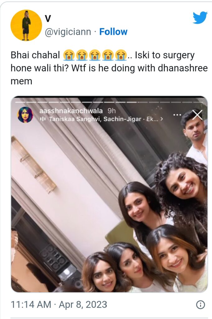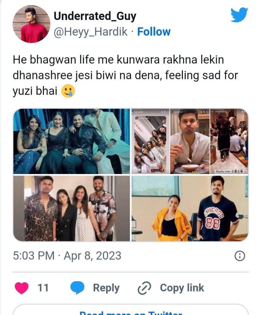 वहीं, एक अन्‍य यूजर ने दोनों की दोस्‍ती की तुलना दिनेश कार्तिक की पूर्व पत्‍नी और मुरली विजय से कर दी है। साथ ही लिखा है कि चहल के साथ दिनेश कार्तिक वाला हाल होगा। अय्यर अगला मुरली विजय निकलेगा। वहीं, एक अन्‍य यूजर ने लिखा है कि अब तो तलाक दे दो चहल भाई।