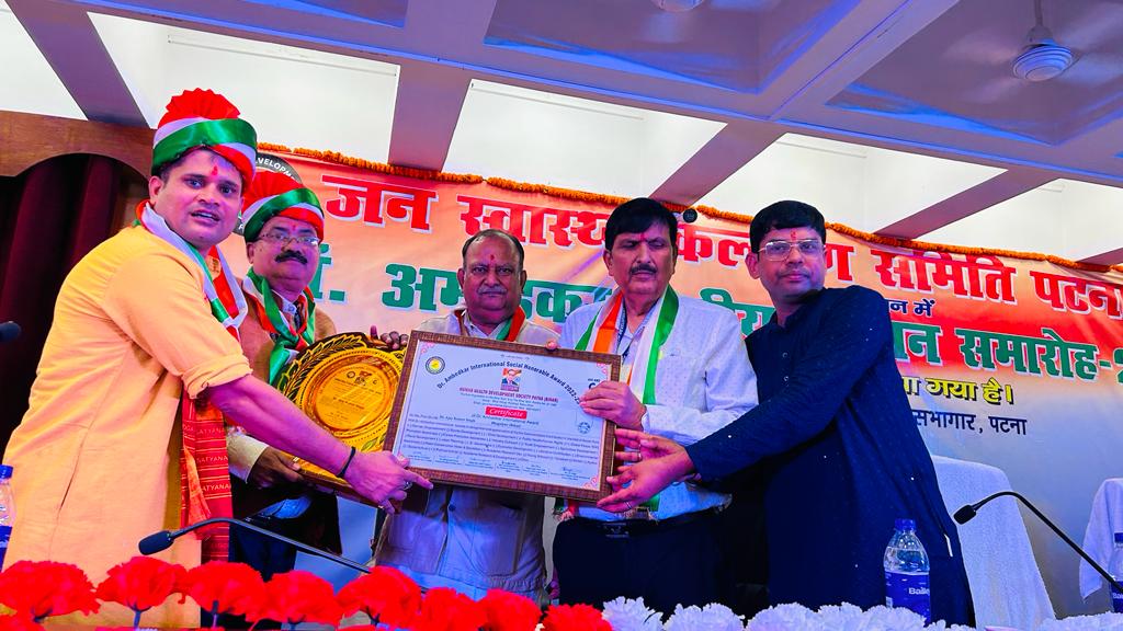 वही स्वास्थ्य ,सड़क सुरक्षा सहित आपदा से बचाव एवं जागरूकता के सभी क्षेत्रों में बेहतर कार्य करने वाले शिशु रोग विशेषज्ञ सह जीवन जागृति सोसायटी के अध्यक्ष डा. अजय सिंह को रविवार को बिहार विधान परिषद के उपसभापति ने डा. अंबेडकर अंतरराष्ट्रीय सोशल हानरेबल अवार्ड से सम्मानित किया। डा. सिंह ने बताया कि जन स्वास्थ्य कल्याण समिति द्वारा आयोजित इस कार्यक्रम में हमे पद्मश्री से सम्मानित सुधा वर्गिश ने प्रशस्ति पत्र और मोमेंटो भेंट किया।