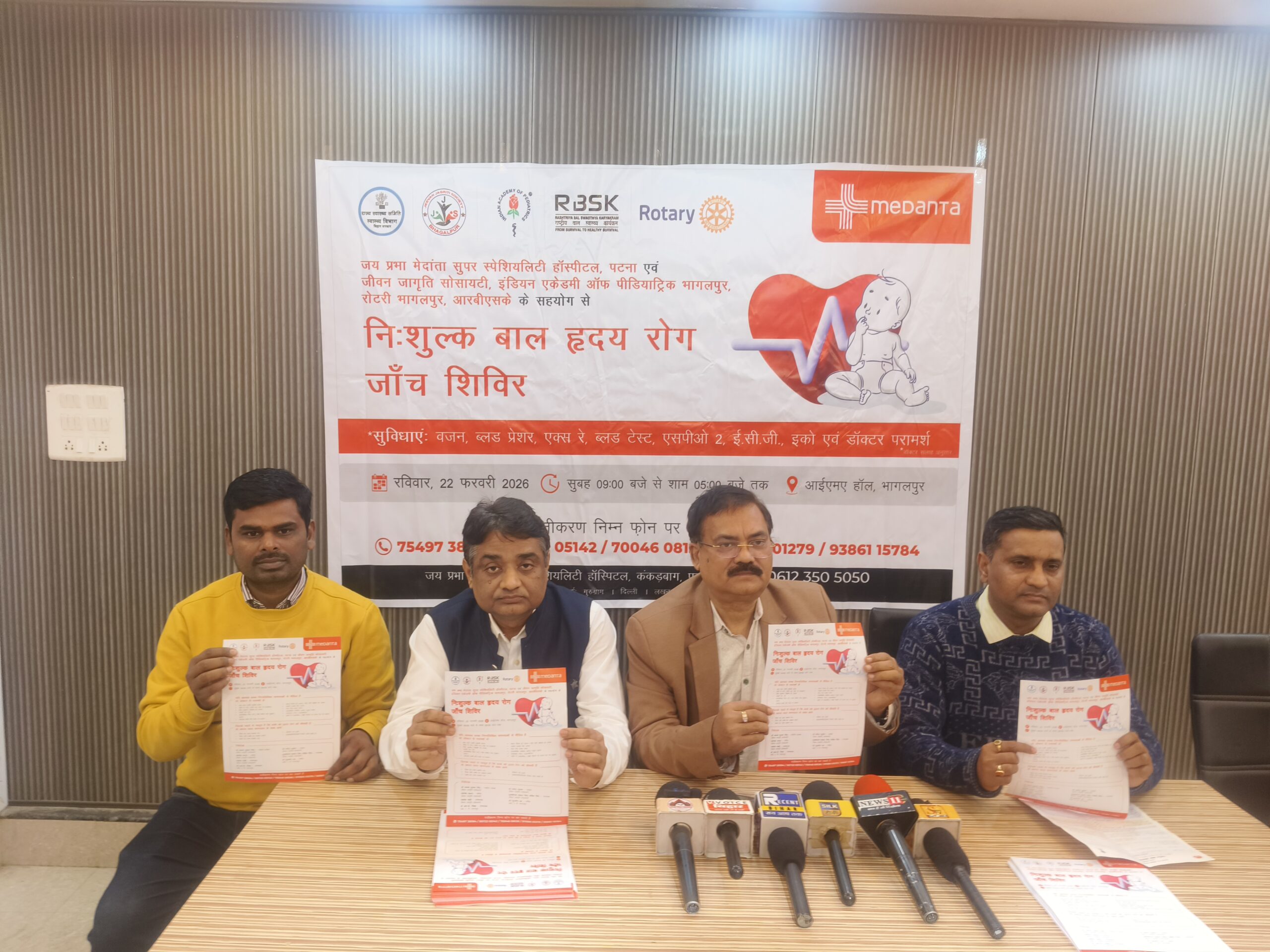 भागलपुर में निःशुल्क बाल हृदय रोग जाँच शिविर को लेकर आज एक प्रेस कॉन्फ्रेंस का आयोजन किया गया। इस दौरान आयोजकों ने शिविर से जुड़ी विस्तृत जानकारी साझा की। यह निःशुल्क शिविर रविवार, 22 फरवरी 2026 को आईएमए हॉल, भागलपुर में सुबह 09 बजे से शाम 05 बजे तक आयोजित किया जाएगा।