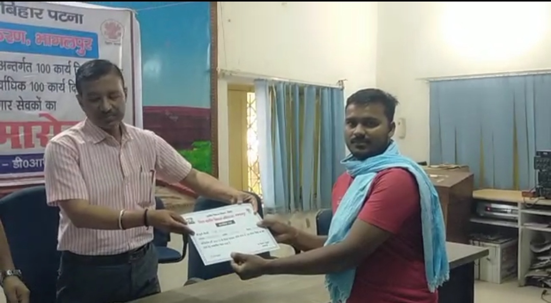 भागलपुर।ग्रामीण विकास विभाग बिहार पटना द्वारा जिला ग्रामीण विकास अभिकरण भागलपुर के तत्वावधान में अंतरराष्ट्रीय श्रम दिवस 2023 के अवसर पर महात्मा गांधी नरेगा अंतर्गत एक सौ कार्य दिवस रोजगार प्राप्त करने वाले मजदूरों एवं पंचायत में सर्वाधिक 100 कार्य दिवस उपलब्ध कराने वाले पंचायत रोजगार सेवकों का सम्मान किया गया,