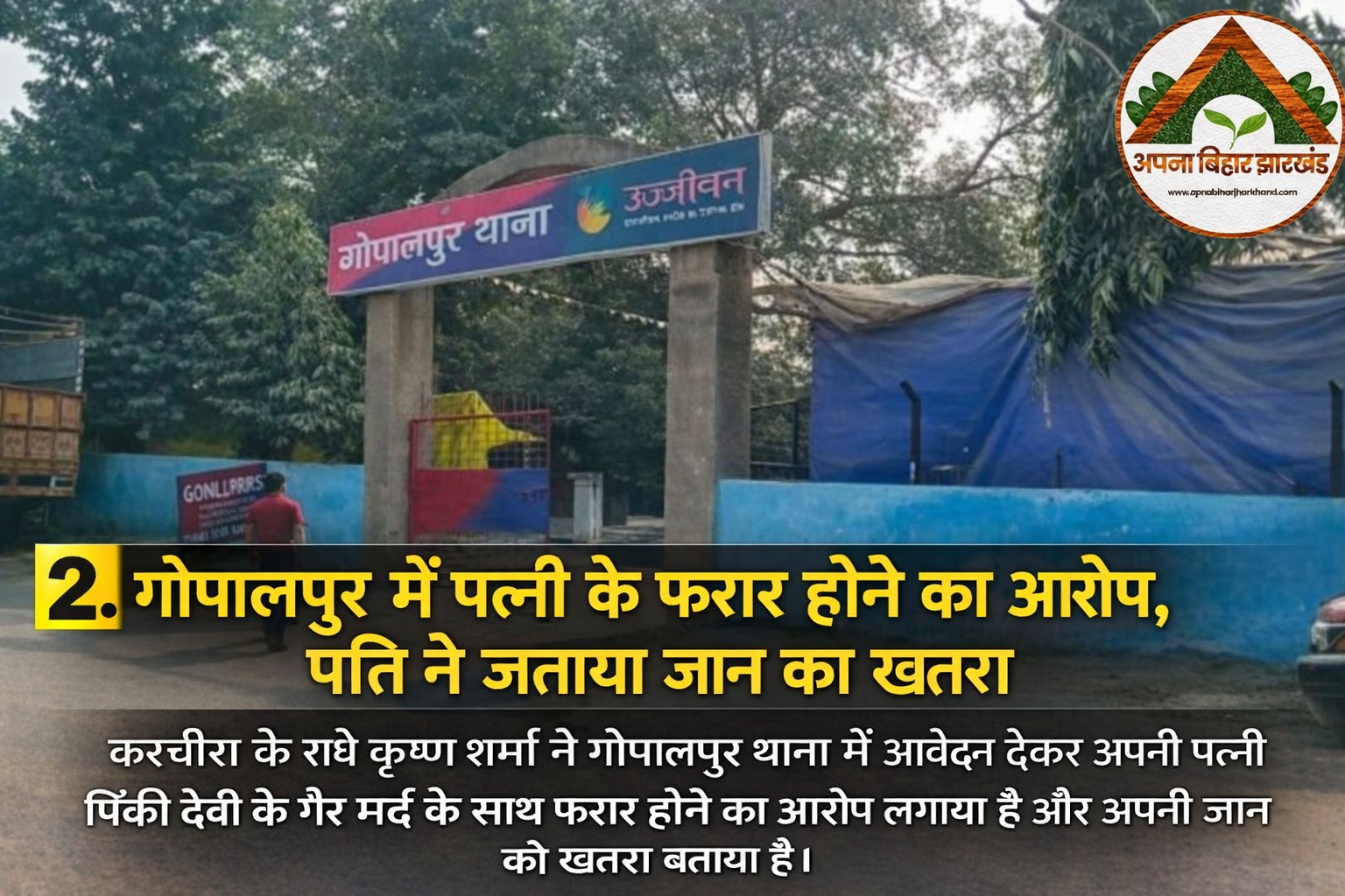 गोपालपुर। करचीरा गांव के राधे कृष्ण शर्मा ने गोपालपुर थाना में आवेदन देकर अपनी पत्नी पिंकी देवी पर गैर मर्द के साथ फरार होने का आरोप लगाया है। उन्होंने पुलिस से मामले की जांच कर उचित कार्रवाई करने और अपनी सुरक्षा सुनिश्चित करने की मांग की है।