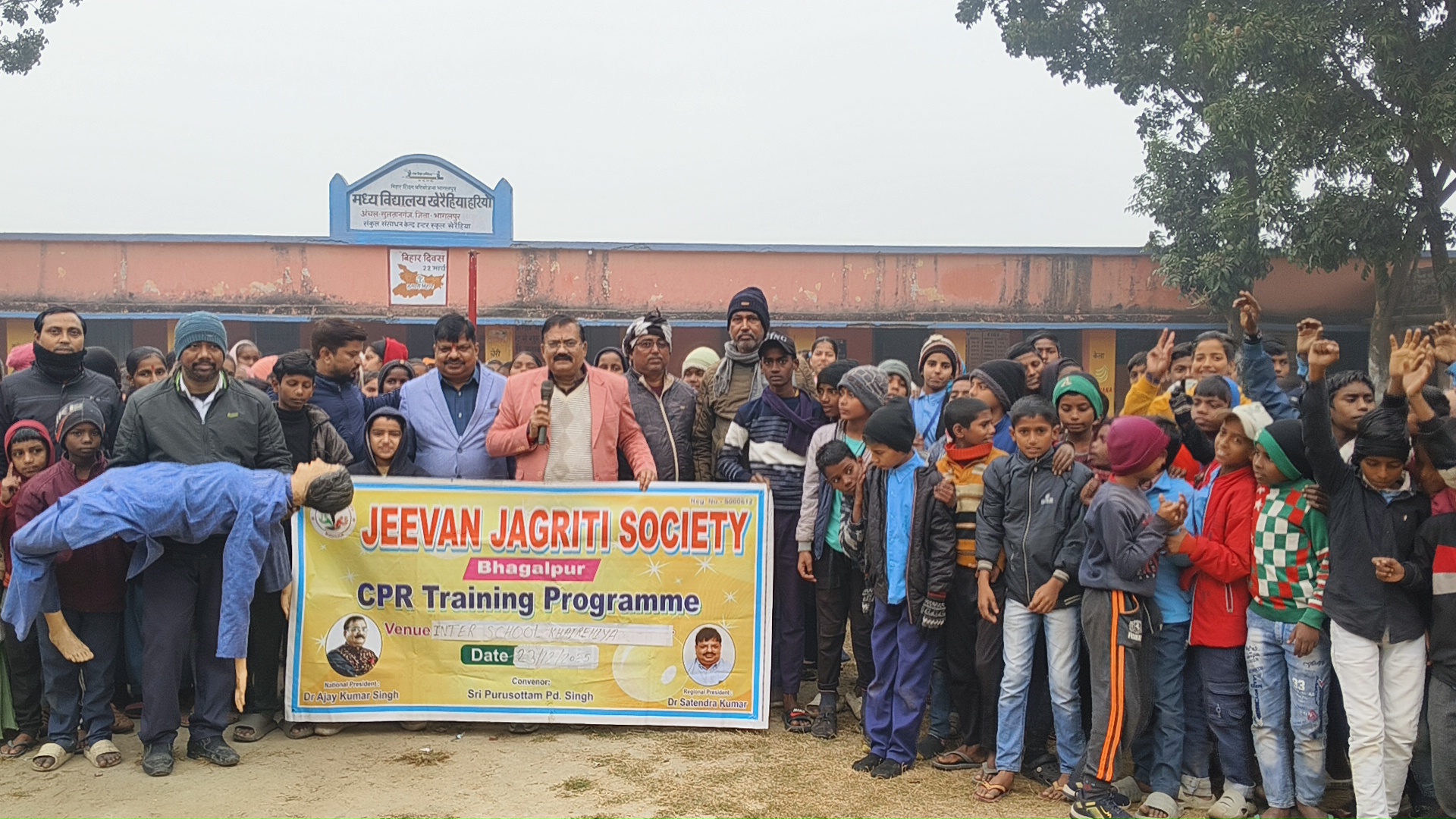 खबर बिहार के भागलपुर से है, जहाँ जीवन रक्षा को लेकर एक सराहनीय और प्रेरणादायक पहल देखने को मिली। समाज में आपात स्थितियों से निपटने की क्षमता विकसित करने के उद्देश्य से जीवन जागृति सोसायटी द्वारा लगातार चलाए जा रहे जागरूकता अभियानों की कड़ी में मध्य विद्यालय खेरहिया में सीपीआर (कार्डियो पल्मोनरी रिससिटेशन) जागरूकता एवं प्रशिक्षण कार्यक्रम का आयोजन किया गया। इस कार्यक्रम में विद्यालय के 200 से अधिक छात्र-छात्राओं को जीवन रक्षक सीपीआर का सैद्धांतिक और व्यावहारिक प्रशिक्षण दिया गया।