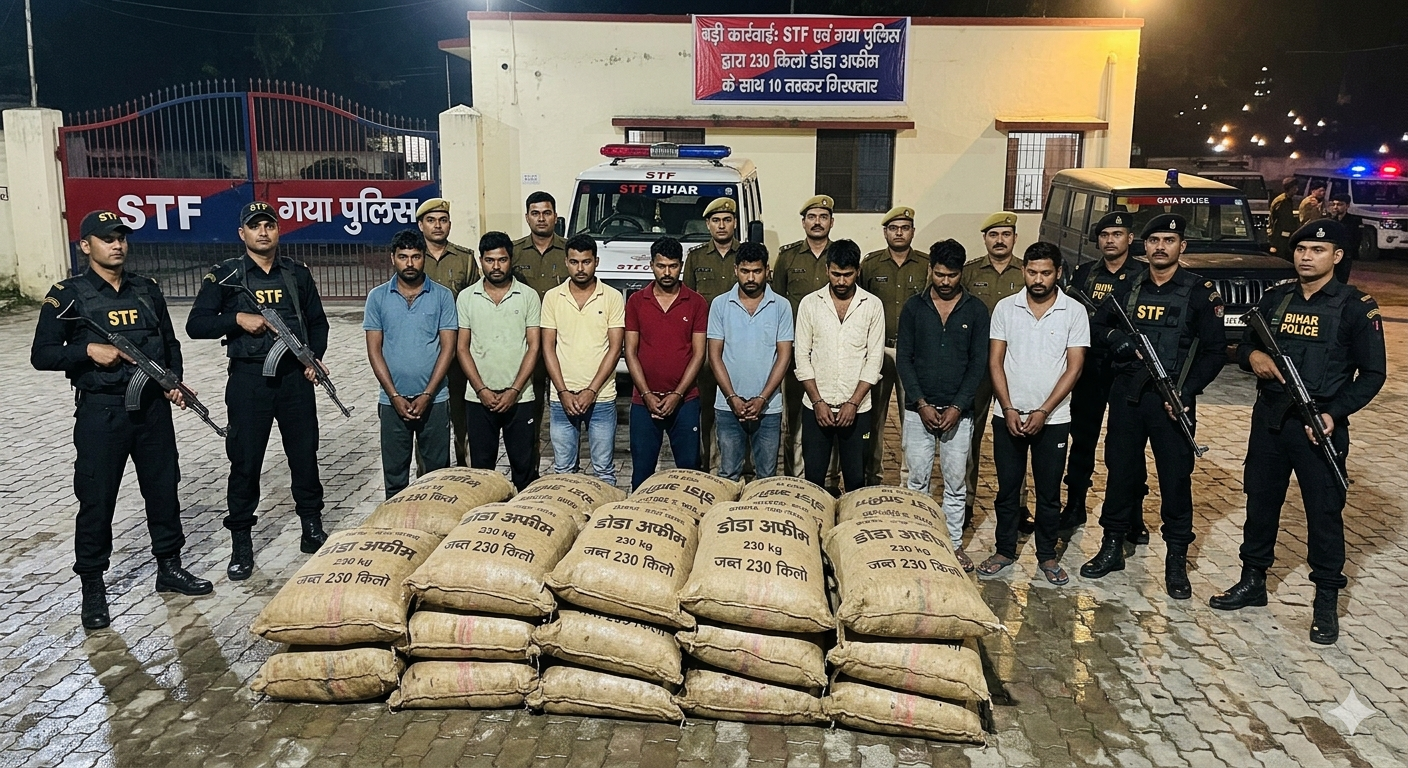 बिहार के गया जिले में नशे के खिलाफ बड़ी कार्रवाई करते हुए एसटीएफ और जिला पुलिस की संयुक्त टीम ने 10 अफीम तस्करों को गिरफ्तार किया है। इस दौरान पुलिस ने भारी मात्रा में डोडा अफीम भी बरामद की है। जानकारी के मुताबिक तस्कर एक पिकअप वैन के जरिए करीब 230 किलो 800 ग्राम डोडा अफीम की खेप लेकर जा रहे थे, तभी पुलिस ने गुप्त सूचना के आधार पर छापेमारी कर उन्हें दबोच लिया।