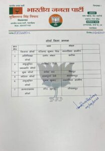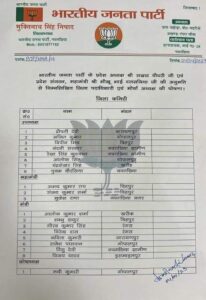 पार्टी के जिला उपाध्यक्ष में द्रोपदी देवी, अजीत कुमार, विपीन मिश्रा, नंदनी सरकार, आलोक सिंह, रेखा सिंह कुशवाहा, पूनम चौरसिया, चन्द्रशेखर सिंह, जिला महामंत्री का दायित्व अभय कुमार राय, संजय शर्मा, मुकेश राणा को दिया गया है। जिला मंत्री का दायित्व आलोक शर्मा, शंभू ठाकुर, वीरेन्द्र दास गौरव सिंह, राजेश पासवान, विजय यादव, कविता देवी, रिंकू देवी, जिला कोषाध्यक्ष रूबी कुमारी को मनोनीत किया गया।