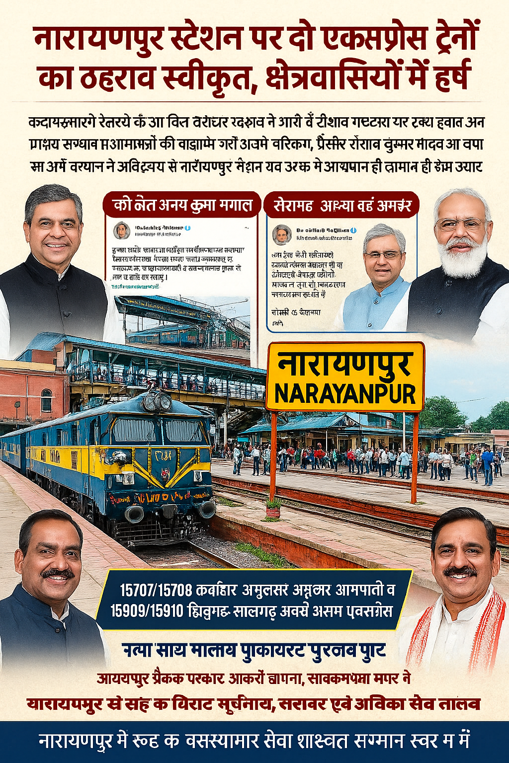नारायणपुर स्टेशन पर दो एक्सप्रेस ट्रेनों का ठहराव स्वीकृत, क्षेत्रवासियों में हर्ष