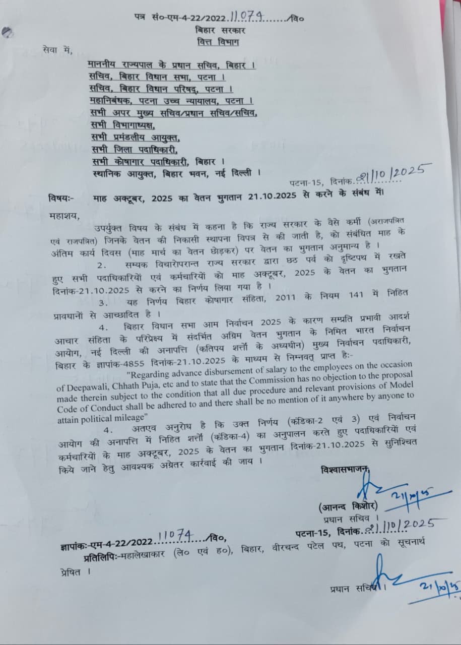 छठ पर्व से पहले बिहार सरकार ने कर्मचारियों को दिया तोहफा, 21 अक्टूबर से वेतन भुगतान शुरू