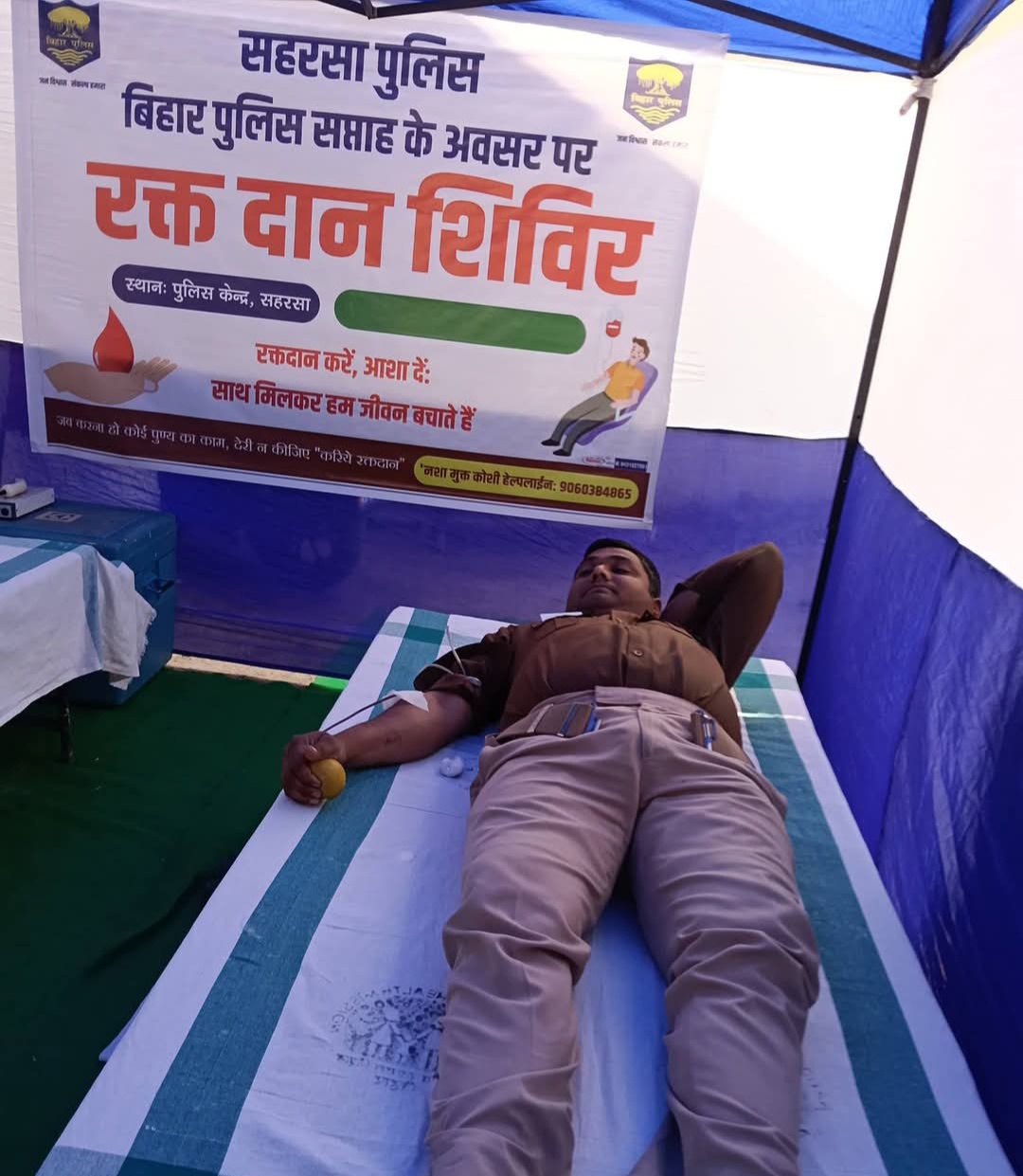 इस अवसर पर सहरसा पुलिस के अधिकारियों एवं जवानों ने बढ़-चढ़कर भाग लिया और स्वेच्छा से रक्तदान कर मानवता की मिसाल पेश की। शिविर में चिकित्सकों की टीम एवं स्वास्थ्य कर्मियों की देखरेख में सभी आवश्यक स्वास्थ्य मानकों का पालन करते हुए रक्त संग्रह किया गया। रक्तदान से पूर्व सभी प्रतिभागियों की स्वास्थ्य जांच की गई, ताकि प्रक्रिया पूरी तरह सुरक्षित और व्यवस्थित रहे।