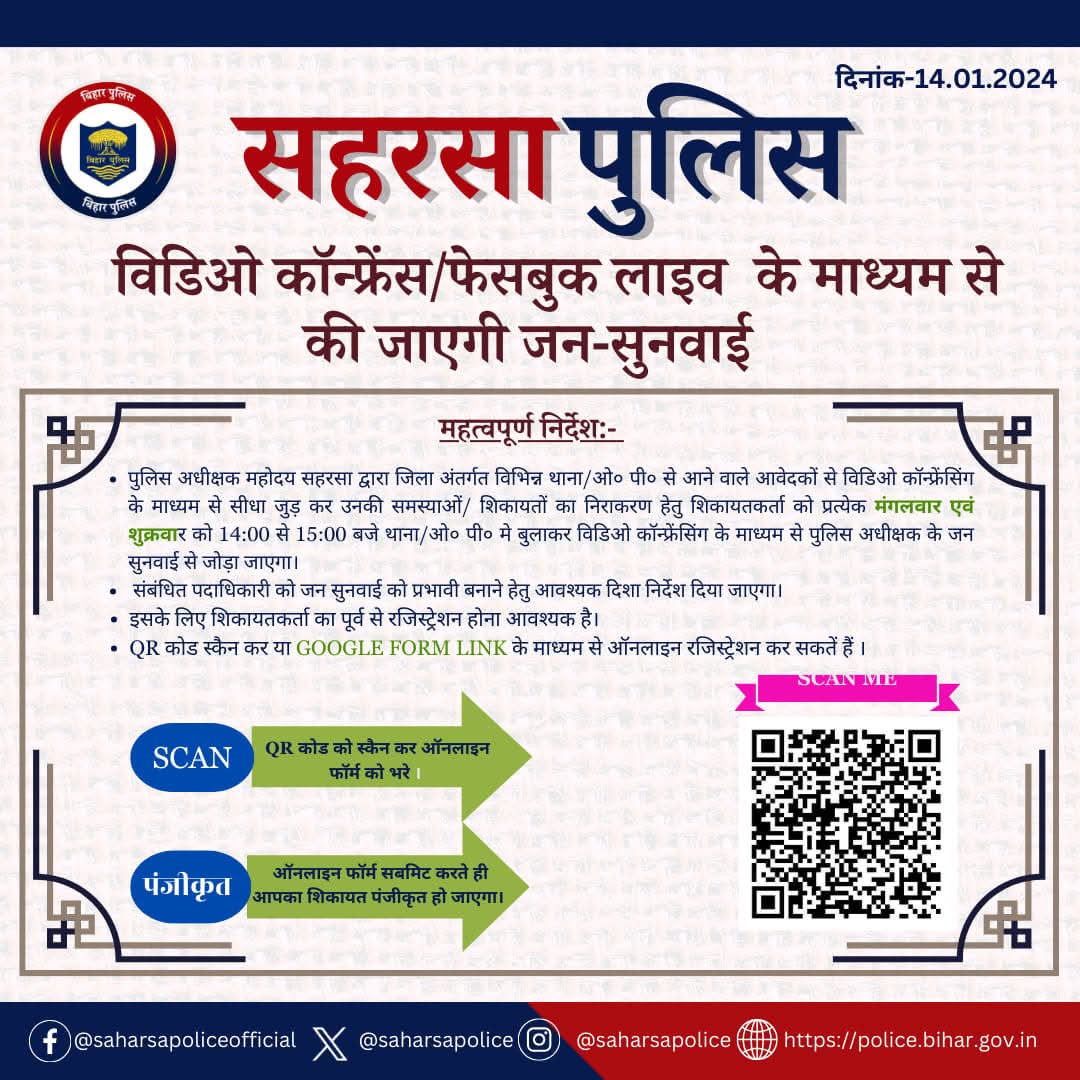 सहरसा पुलिस ने आम नागरिकों से अपील की है कि वे अपनी शिकायतों के समाधान के लिए इस सुविधा का लाभ उठाएं और निर्धारित प्रक्रिया के अनुसार रजिस्ट्रेशन कराएं। पुलिस का उद्देश्य है कि जन-समस्याओं का त्वरित, निष्पक्ष और पारदर्शी निपटारा सुनिश्चित किया जा सके।