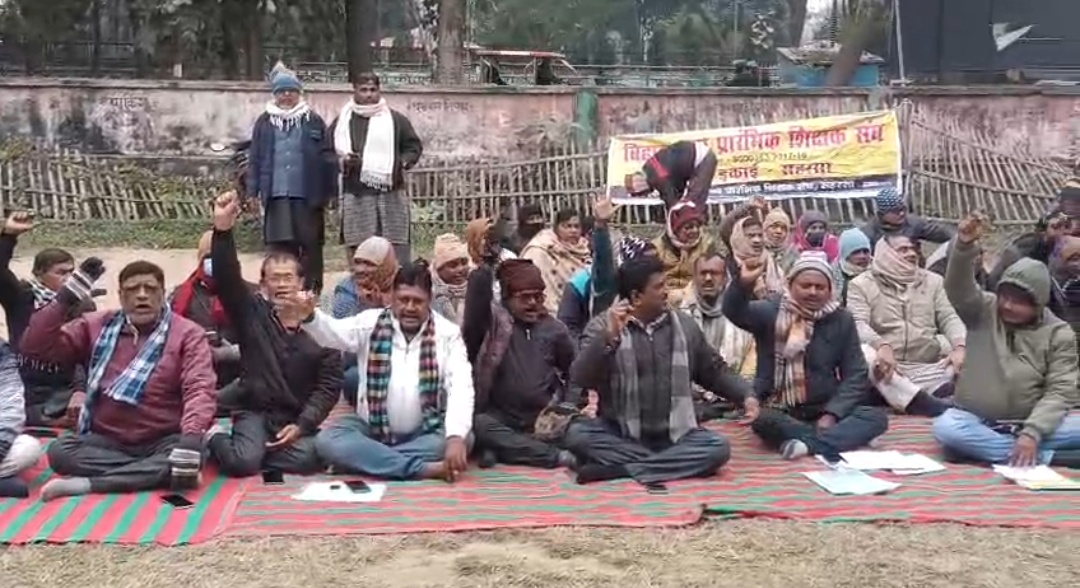 नियोजित शिक्षकों की प्रोन्नति और स्थानांतरण की मांग को लेकर मधेपुरा में जोरदार धरना